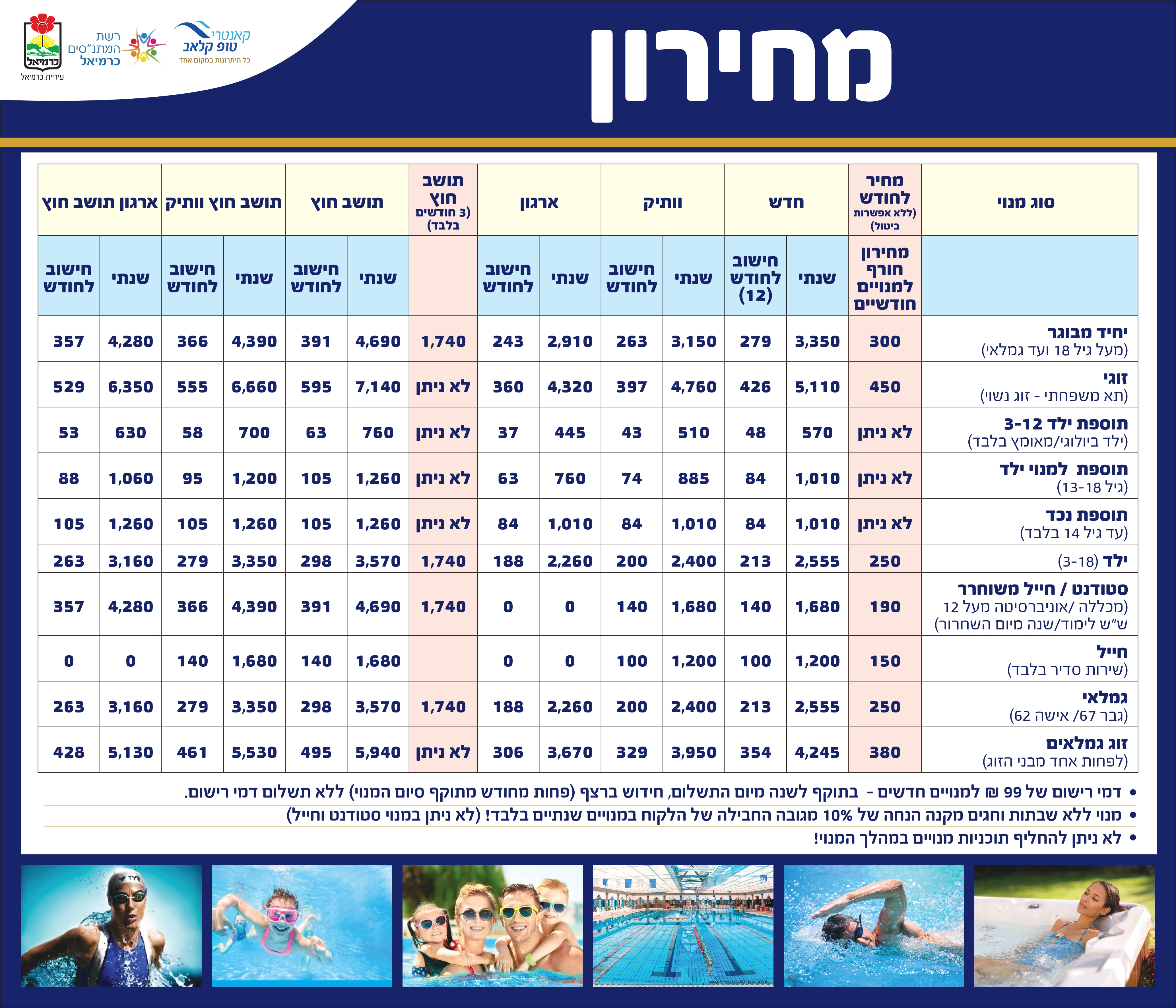 | סוג מנוי | מחיר לחודש (ללא אפשרות ביטול) | חדש חודשי | חדש שנתי | ותיק חודשי | ותיק שנתי | ארגון חודשי | ארגון שנתי | תושב חוץ (3 חודשים בלבד) | תושב חוץ חודשי | תושב חוץ שנתי | תושב חוץ ותיק חודשי | תושב חוץ ותיק שנתי | ארגון תושב חוץ חודשי | ארגון תושב חוץ שנתי |